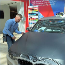 A BMW 3 Series was on display at 3M’s head office in Bracknell, Berkshire, for the vehicle wrapping event and Michael showed how it could be personalised using 3M Wrap Film Series 1380 in a series of live demonstrations.