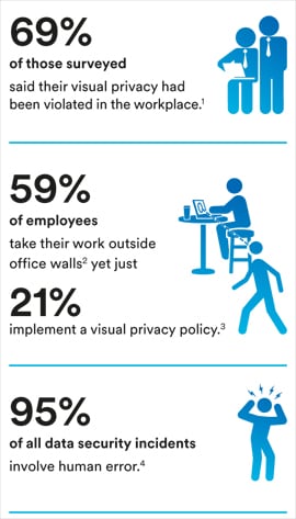 • Four out of five mobile workers recently surveyed by Ponemon Institute said they’ve caught someone looking over their shoulder at their laptop screen in a public space. This low-tech threat, known as visual hacking, is a growing concern as more workers are accessing confidential company information outside of the office in public spaces.